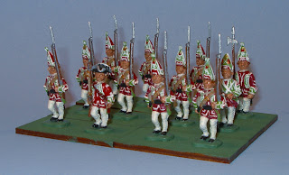 The 1st division of the regiment, consisting of one officer (second from left, front rank), one sergeant (far right, rear rank), one drummer (far right, second rank), and nine privates. Notice the sergeant is checking on the alignment of his men. You can almost hear him saying, "You there, Jones, watch your dressing, you slovenly excuse for a soldier of the King!"